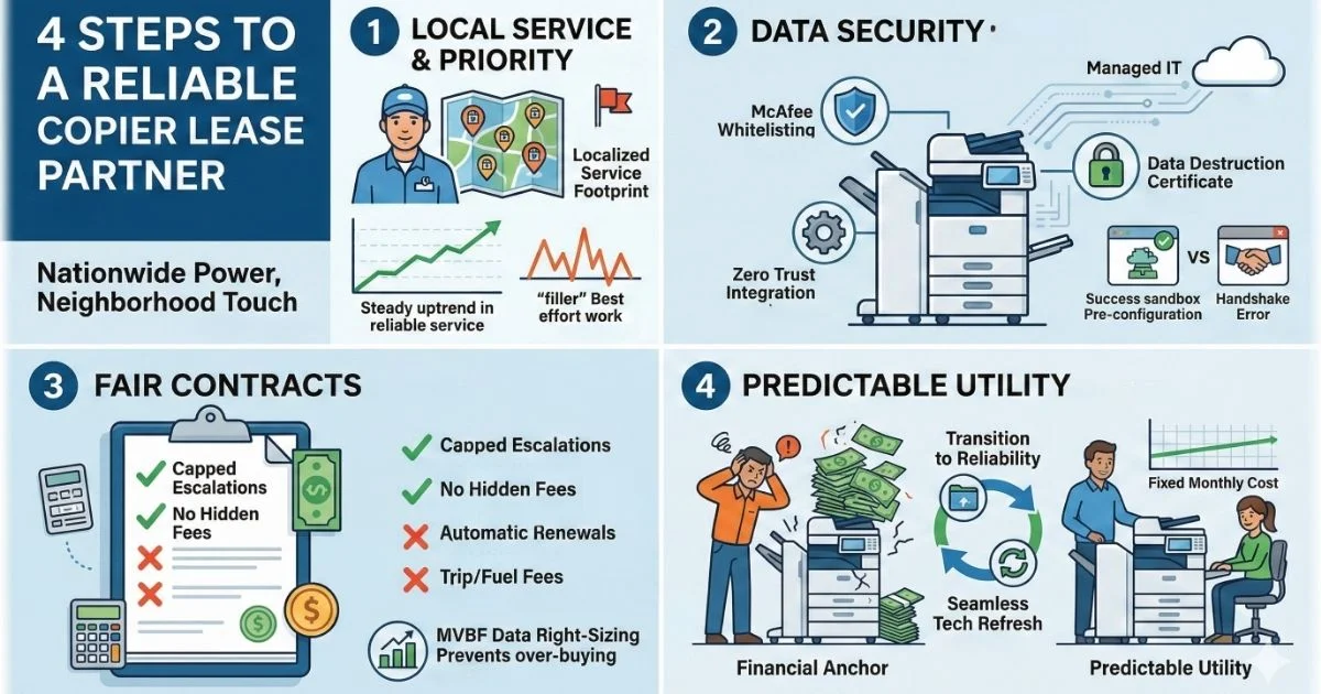 Four-step guide to a Reliable Copier Lease in Long Beach, covering local service footprints, Data Security, Fair Contracts, and Predictable Utility.